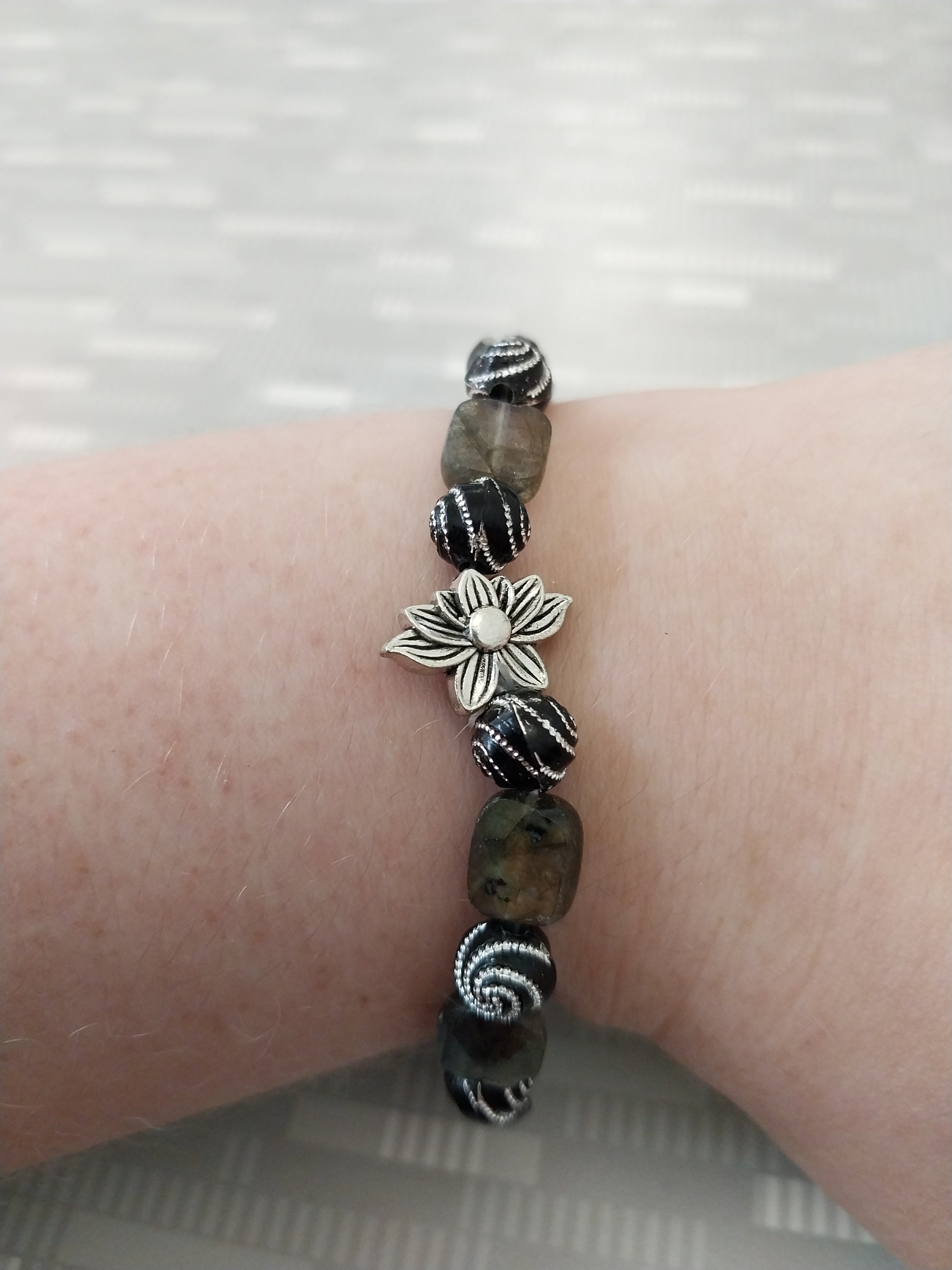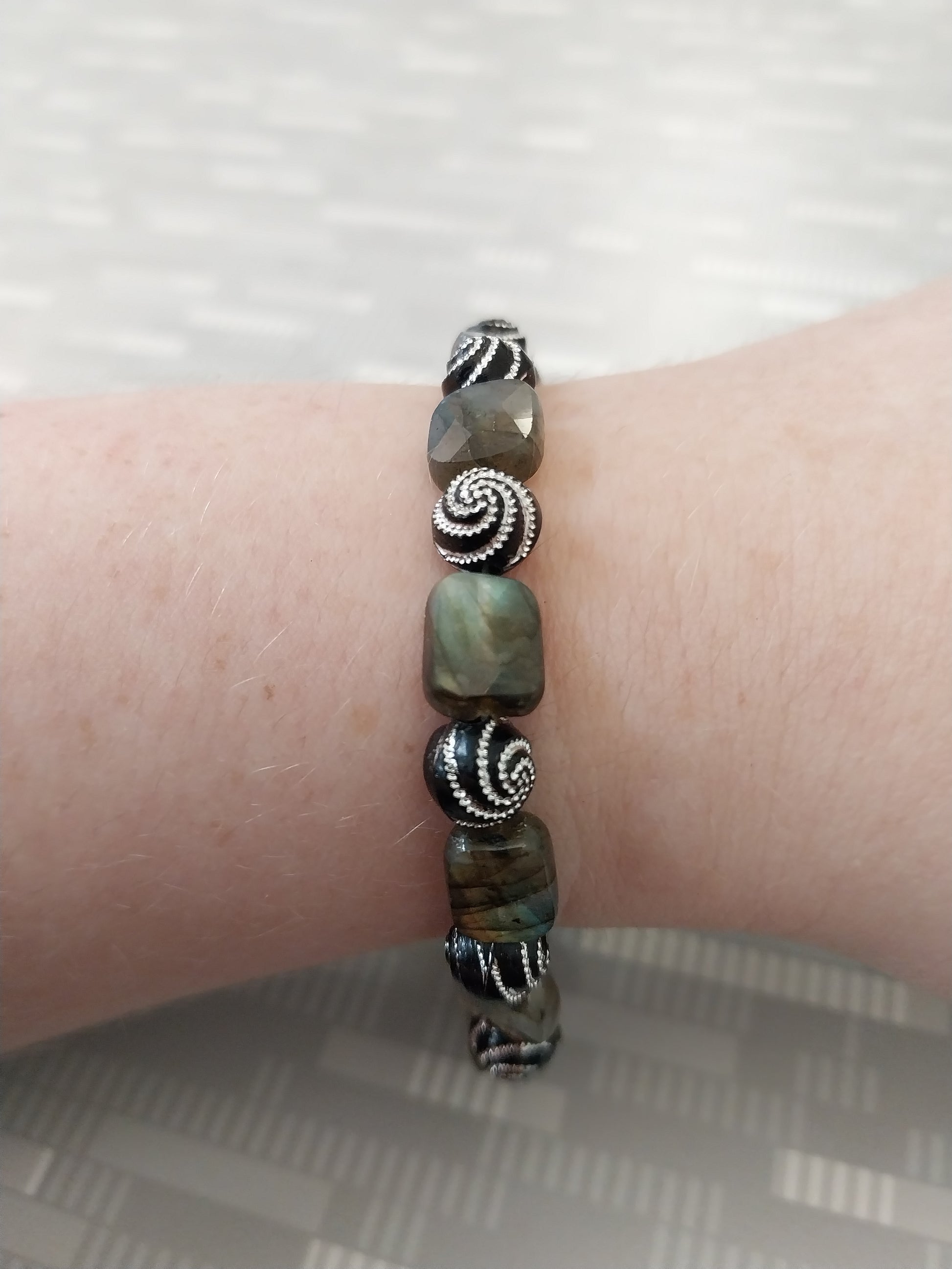 A dance of duality, this bracelet weaves together the grounding shimmer of rectangular labradorite with the hypnotic pull of black beads etched in silver spirals—each one a portal, each one a breath. Labradorite, the stone of transformation and inner vision, anchors the piece with its stormy iridescence, inviting you to trust the unseen and honor your evolution. Between each stone, the silver swirl beads echo cycles of healing, memory, and return.