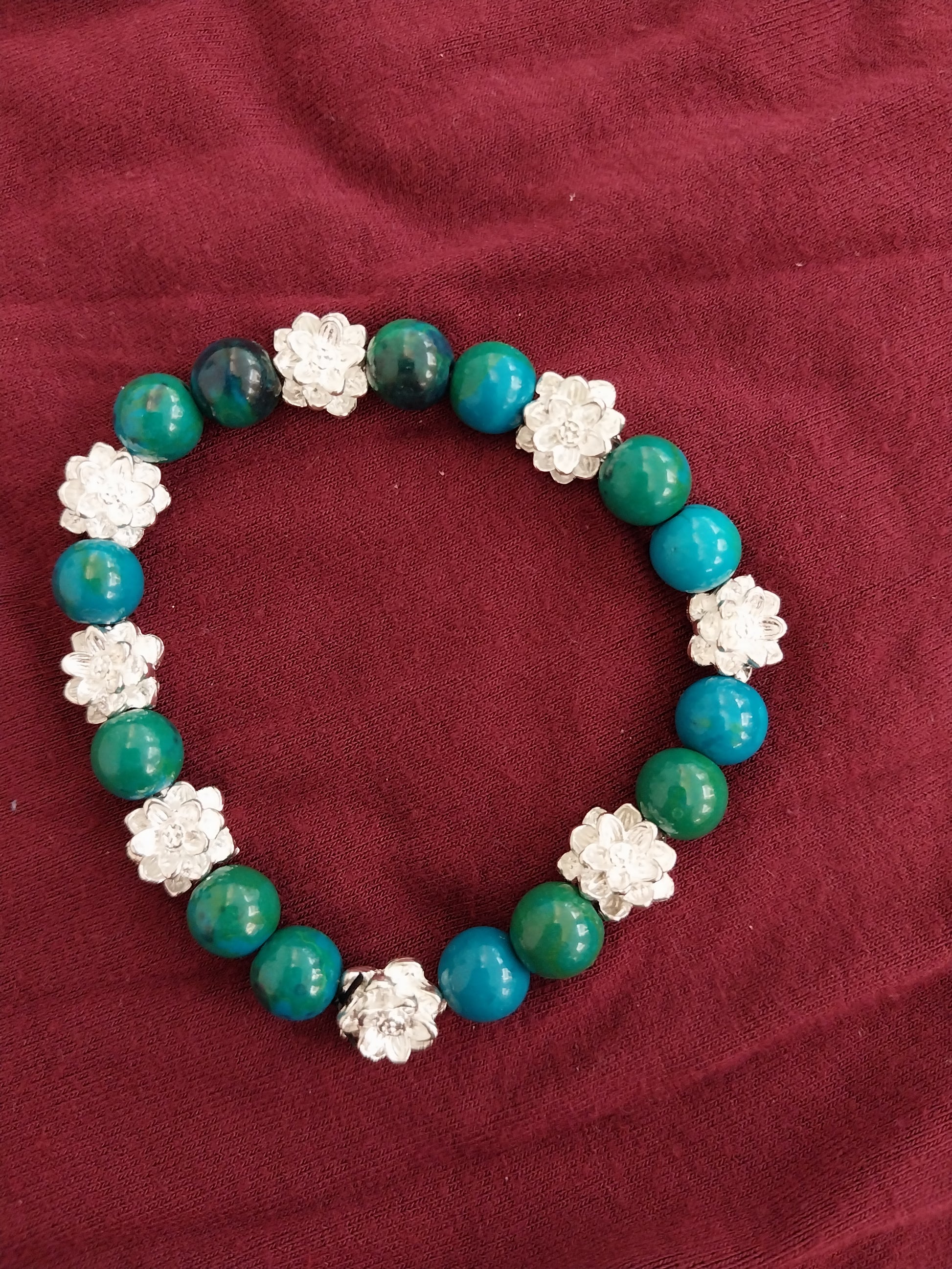This 6.5-inch bracelet is a luminous fusion of chrysocolla’s tranquil blues and greens with radiant lotus accents—an offering of emotional clarity and heart-centered courage. Like a lotus rising through water, Lotus Tide invites you to bloom from any depth, guided by the wisdom of the waves and the calm of your own voice.