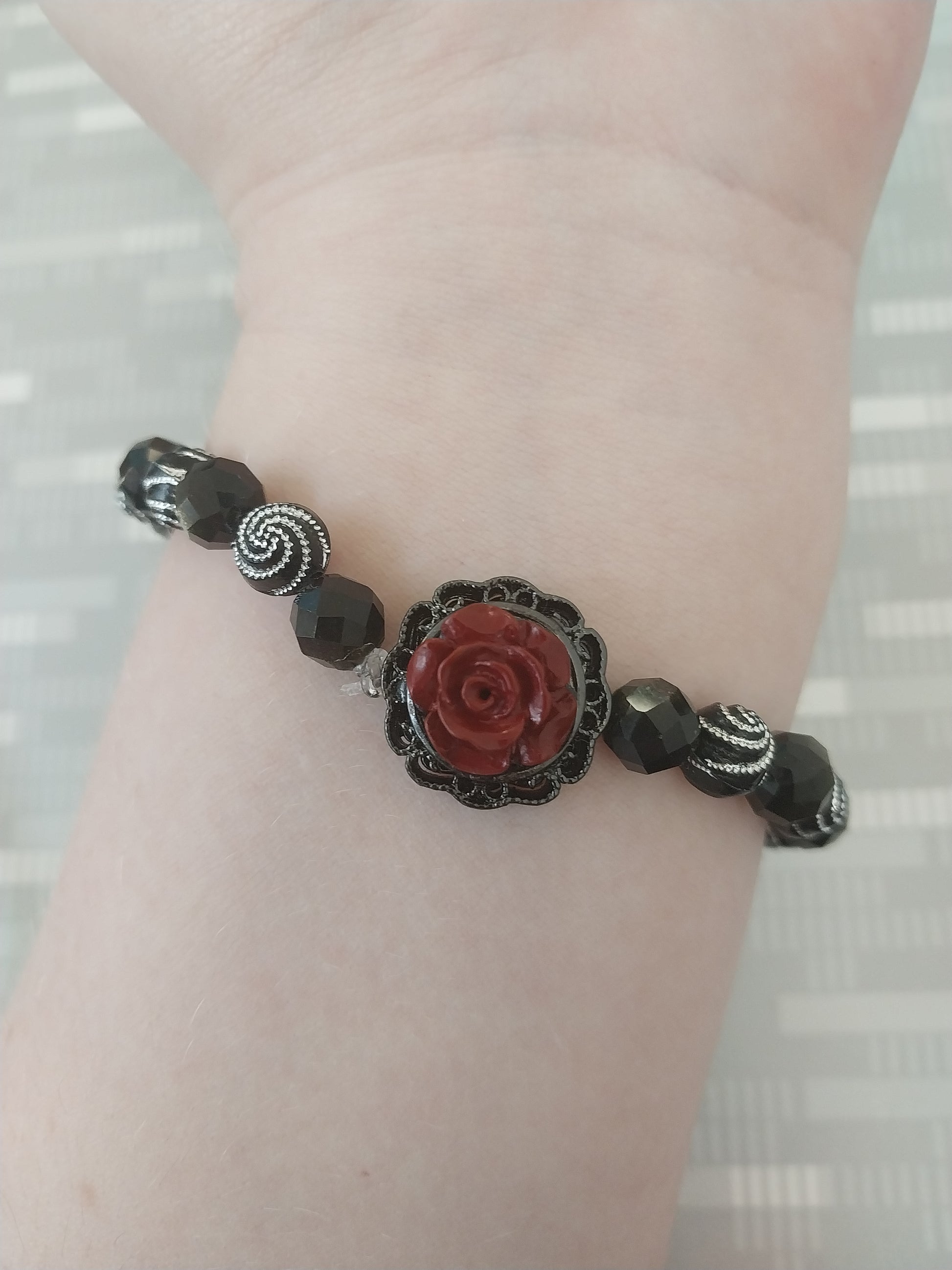 A crimson acrylic rose anchors the piece with fierce softness, while a silver moon cradles a curious cat reaching for stars—a symbol of wonder, intuition, and the quiet courage to wish. This bracelet is a spell of self-trust, a whisper of magic, and a reminder that even in the deepest night, you are blooming.