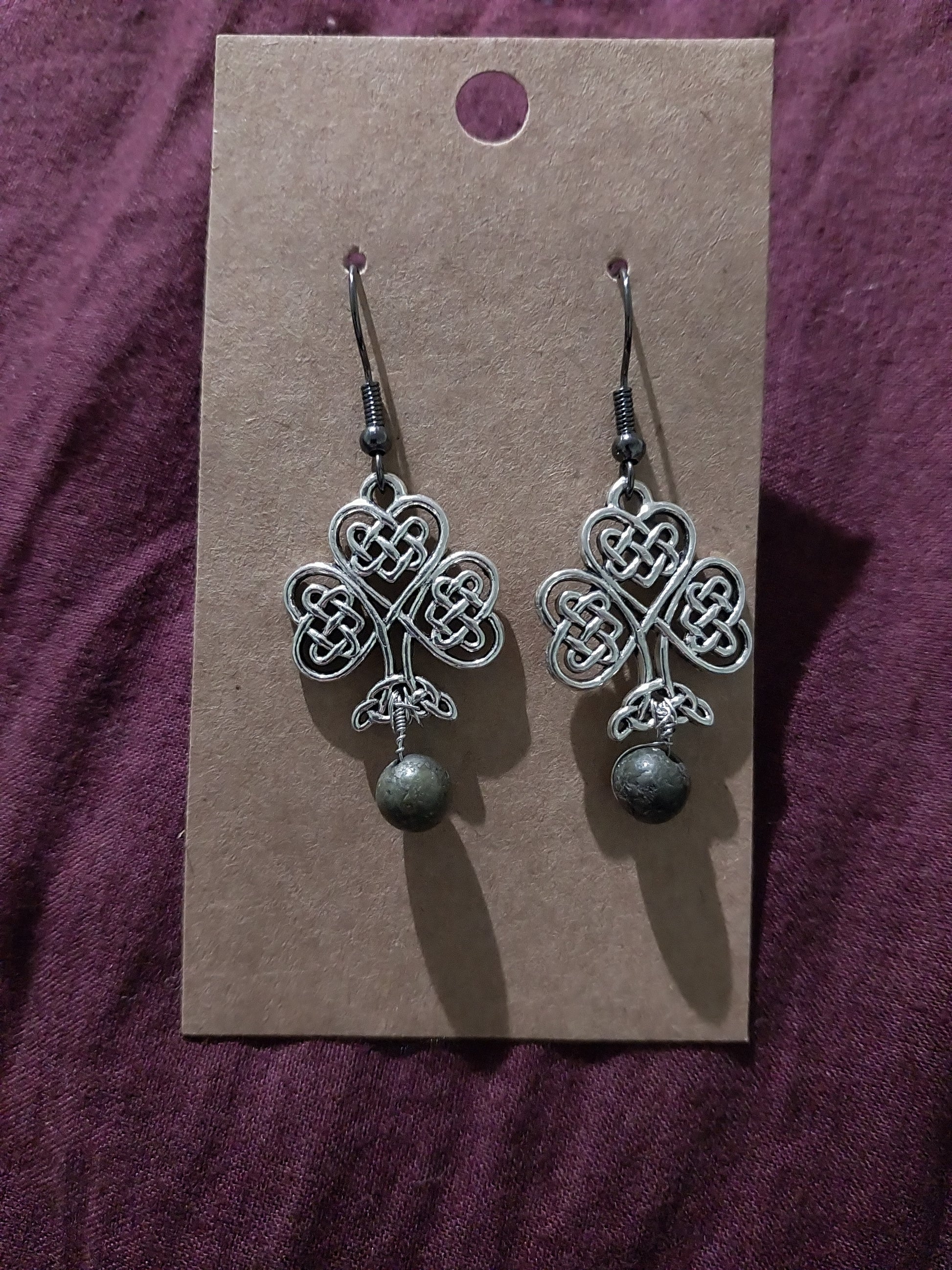 Grounded in growth, woven with intention. “Rooted Luck” is a talisman of transformation—featuring intricate silver knotwork in the shape of a four-leaf clover, paired with the earthy power of epidote. These earrings are more than adornment; they’re a whisper from the universe to trust your path and expand with grace.