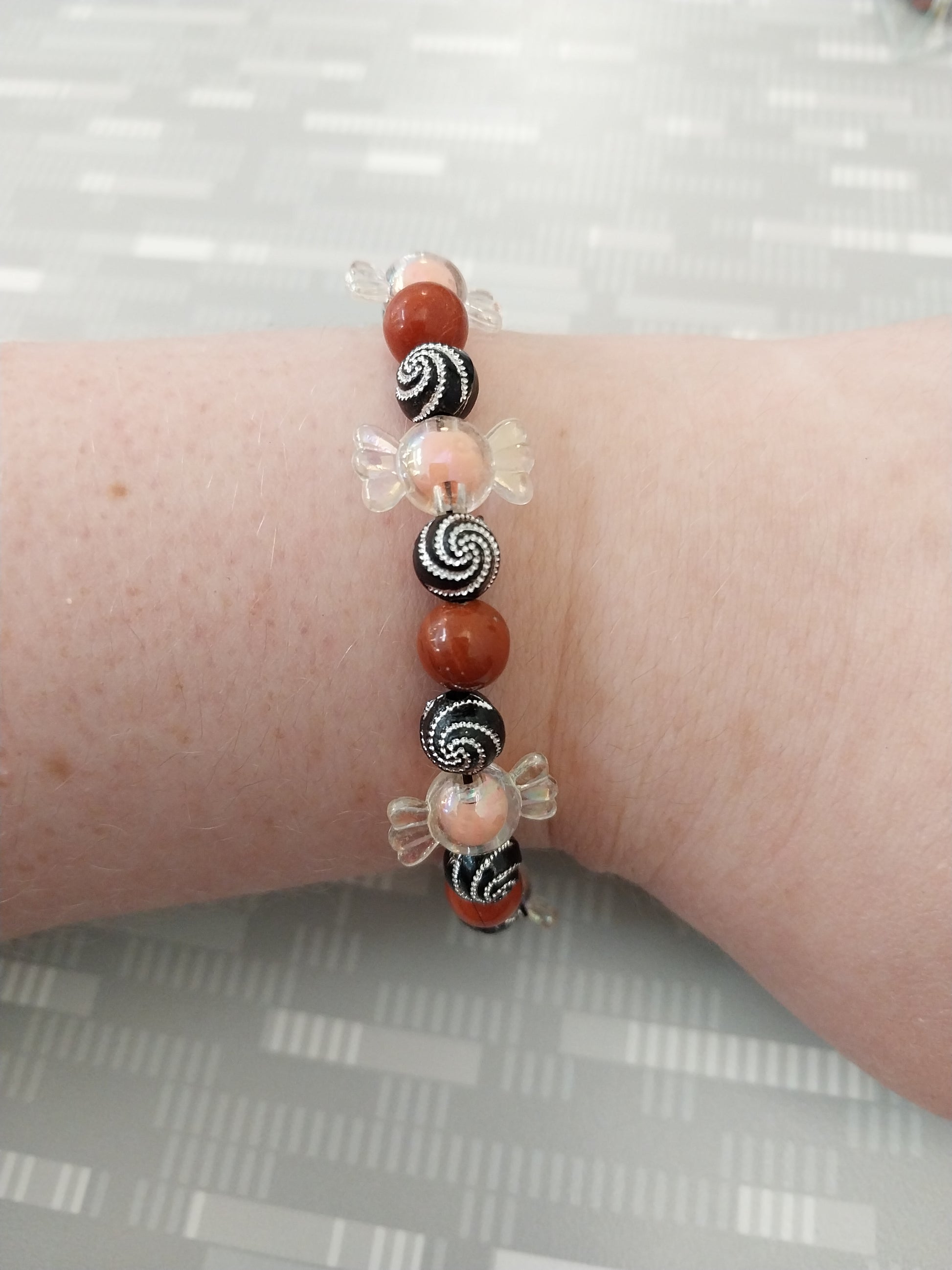 This radiant piece blends elemental strength with childlike wonder. Red jasper beads pulse with earthy vitality, grounding the wearer in courage and emotional stability. Black beads etched with silver spirals evoke ancient wisdom and protective motion—like cosmic fingerprints guiding your path. Iridescent candy-shaped beads sparkle with delight, reminding you to savor sweetness even in transformation.